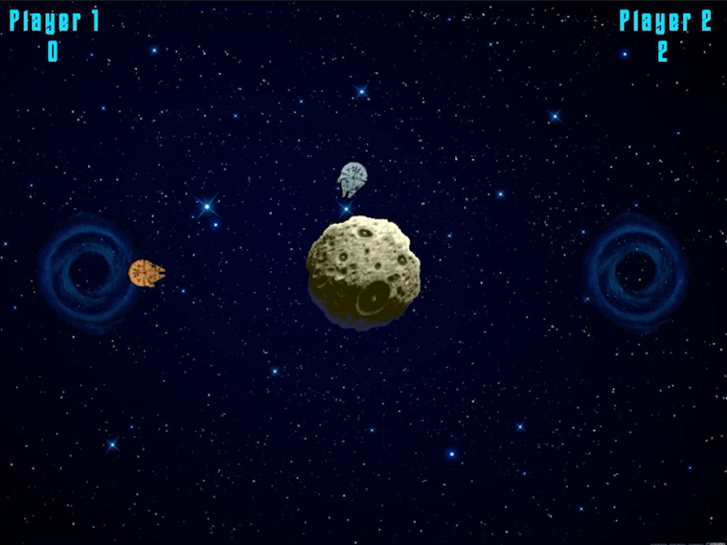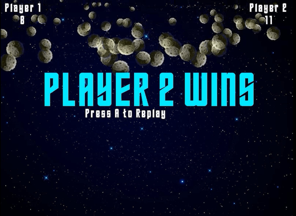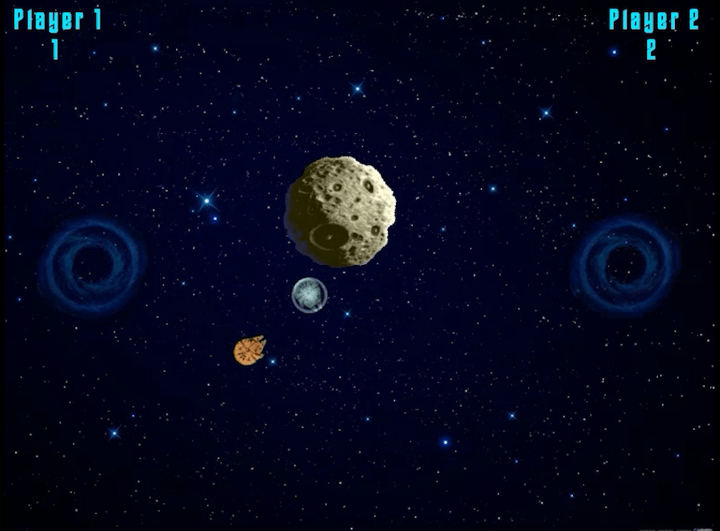 In this two player game, each player controls a small spaceship and attempts to score a goal on the other player with a floating asteroid.