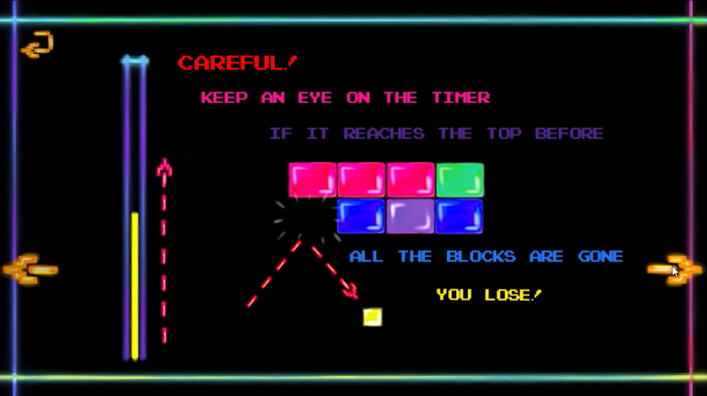 This game is a simple block breaking game with 1 player and ten levels. Each level brings with it new brick types and harder gameplay. The levels are timed and the player must wipe the board clean before the time is up to progress to the next level.