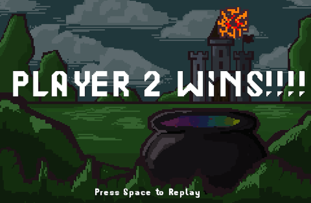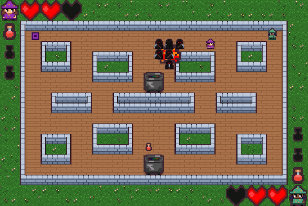 This game is a map based game that invites two players to go against one another in a deathmatch-like game of exploding potions. Cauldrons emit potions to be collected, each giving unique powerups or adding attacks. Players must tactically place exploding potions to catch the other player, without losing a life of their own.