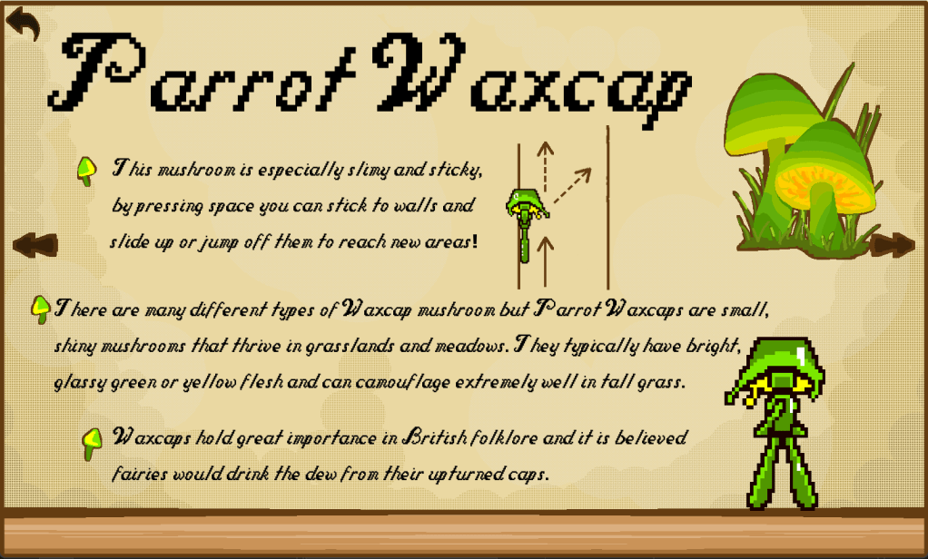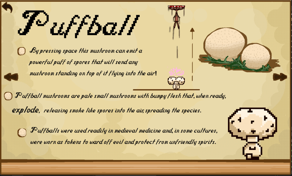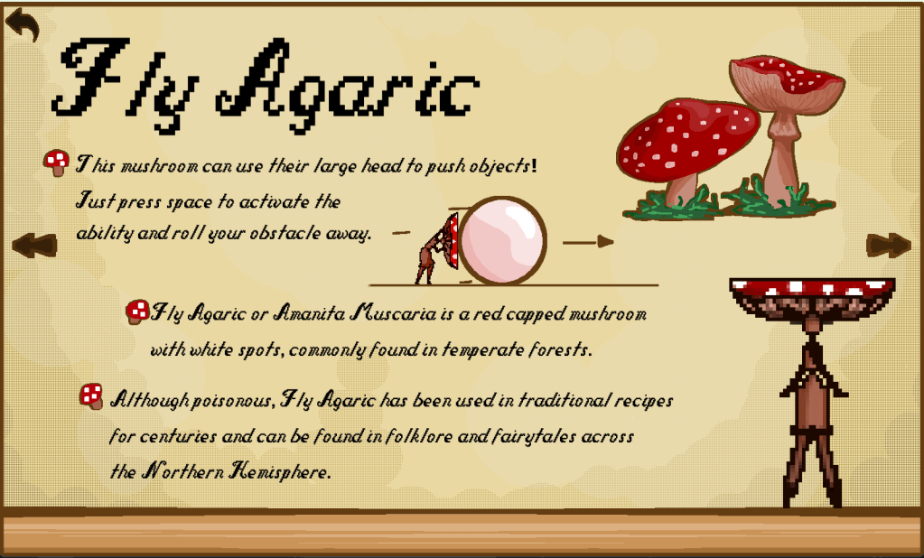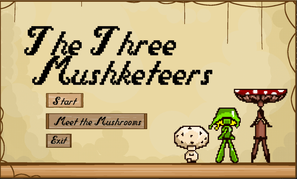 The Three Musketeers is a single player puzzle platformer game. In this game the player switches between three mushrooms of varying species and with varying abilities, and must use all three to escape the home of the forager that took them. A Puffball mushroom can shoot others into the air, a Parrot Waxcap mushroom can stick to surfaces and a Fly Agaric mushroom can push round objects. Only together and by tactically using each of their abilities can they escape and player progress.